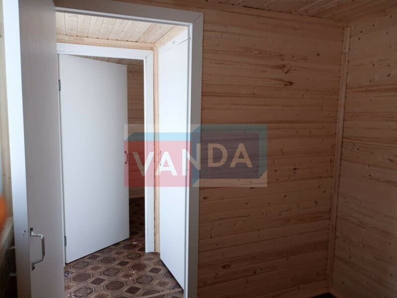 Блок контейнер прорабская №2 (вариант 2) изготавливается из несущего каркаса (верхняя и нижняя обвязка): швеллер 120х50х3 мм., угловые стойки: сложно - гнутый угол 90х90х3 мм., крыша блок-контейнера: металл сварной 0,9-1 мм., качественная наружная отделка: оцинкованный профлист, внутренняя отделка стен: Вагонка деревянная, внутренняя отделка потолка: Вагонка деревянная, вспомогательный деревянный каркас (стены): брусок 40х75 мм., лаги пола: обрезная доска 40х100 мм., лаги потолка: обрезная доска 40х100 мм., выполнено утепление: Минеральная вата «ISOVER» – 100 мм. и пароизоляция: плёнка техническая, черновой пол состоит из: обрезная доска 20 мм. (2 сорт), чистовой пол покрыт: ДСП строительное 16 мм., отделка пола: линолеум полукоммерческий. Контейнер комплектуется окнами: ПВХ однокамерное, одностворчатое, п/о 900х1100, входной дверью: ДГ 21-8 обшита снаружи оцинкованным листом, врезной замок и внутренними дверями: ДГ 21-8 (при наличии перегородки). Если в БК присутствуют перегородки, то для них используется: брусок 40х50 мм.